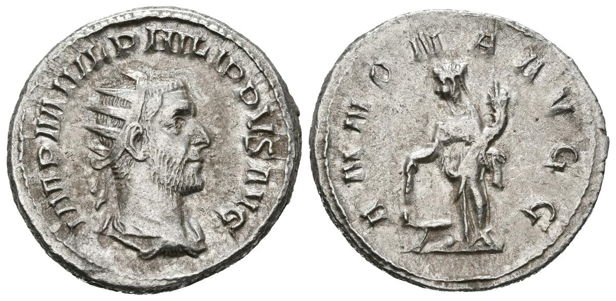 FILIPO I. Antoniniano. (Ar. 4,38g/22mm). 246 d.C. Roma. (RIC 29). Anv: Busto radiado y drapeado de Filipo I a derecha, alrededor leyenda: IMP M IVL PHILIPPVS AVG. Rev: Annona estante a izquierda sobre proa portando espiga y cornucopia, alrededor leyenda: ANNONA AVGG. MBC.