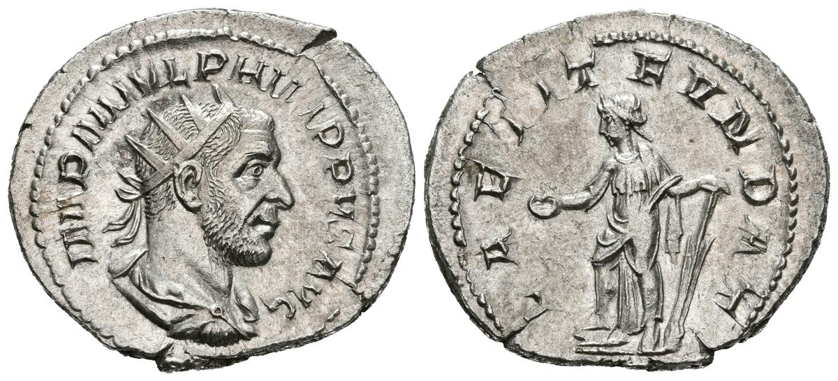 FILIPO I. Antoniniano. (Ar. 4,47g/24mm). 244-247 d.C. Roma. (RIC 37b). Anv: Busto radiado y drapeado de Filipo I a derecha, alrededor leyenda: IMP M IVL PHILIPPVS AVG. Rev: Laetitia estante a izquierda sobre proa portando patera y timón, alrededor leyenda: LAETIT FVNDAT. MBC+.