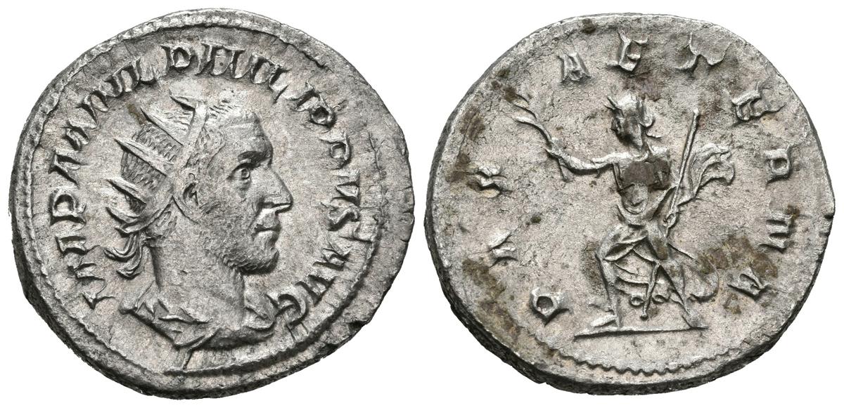 FILIPO I. Antoniniano. (Ar. 4,78g/23mm). 244 d.C. Roma. (RIC 41). Anv: Busto radiado y drapeado a derecha, alrededor leyenda: IMP M IVL PHILIPPVS AVG. Rev: Pax avanzando a izquierda portando rama y cetro, alrededor leyenda: PAX AETERNA. MBC.