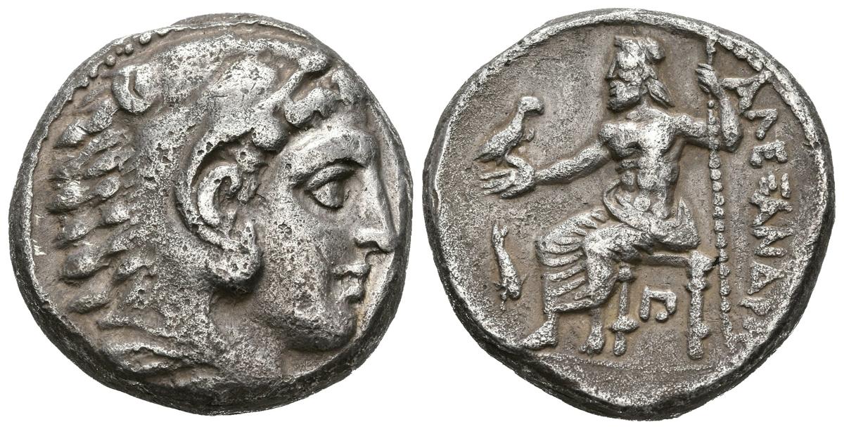 REYES DE MACEDONIA, Alejandro III el Grande. Tetradracma. (Ar. 16,98g/24mm). 316-311 a.C. Amphipolis. (Price 133). Anv: Cabeza de Hércules con piel de león a derecha. Rev: Zeus sentado a izquierda portando águila y cetro, en campo delfín hacia abajo, debajo del trono letra griega, detrás leyenda griega. MBC.