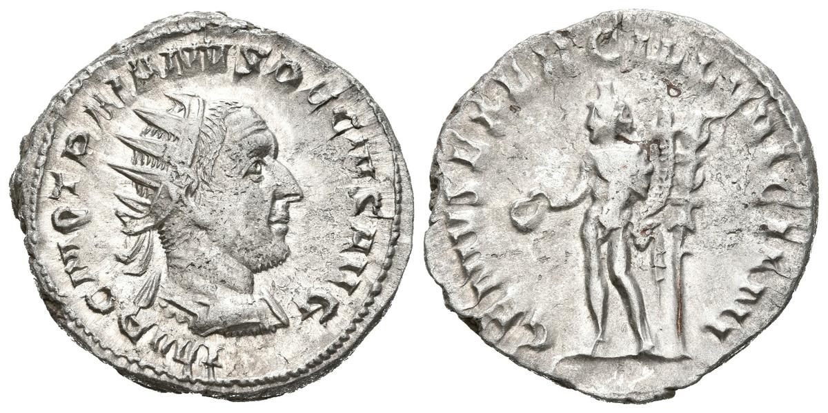 TRAJANO DECIO. Antoniniano. (Ar. 4,45g/22mm). 249-251 d.C. Roma. (RIC 16c). Anv: Busto radiado, drapeado y con coraza de Trajano Decio a derecha, alrededor leyenda: IMP C M Q TRAIANVS DECIVS AVG. Rev: Genio estante a izquierda portando patera y cornucopia, detrás estandarte, alrededor leyenda: GENIVS EXERC ILLVRICIANI. MBC+. Bonito ejemplar con restos de brillo original.