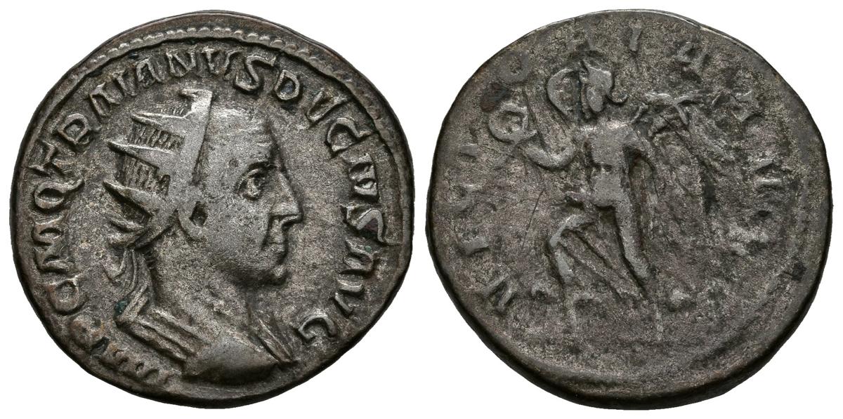 TRAJANO DECIO. Antoniniano (Ar. 4,30g/21mm). 249-251 d.C. Roma. (RIC 29a). Anv: Busto radiado y drapeado de Trajano Decio a derecha, alrededor leyenda: IMP C M Q TRAIANVS DECIVS AVG. Rev: Victoria avanzando a izquierda portando corona de laurel, alrededor leyenda: VICTORIA AVG. MBC/MBC-.
