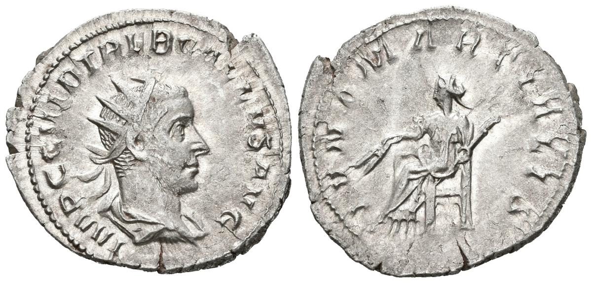 TREBONIANO GALO. Antoniniano. (Ar. 3,30g/24mm). 251-253 d.C. Roma. (RIC 69). Anv: Busto radiado y drapeado de Treboniano Galo a derecha, alrededor leyenda: IMP C C VIB TREB GALLVS AVG. Rev: Juno sentado a izquierda portando granos y cetro, alrededor leyenda: IVNO MARTIALIS. MBC+. Bonito ejemplar con restos de brillo original.