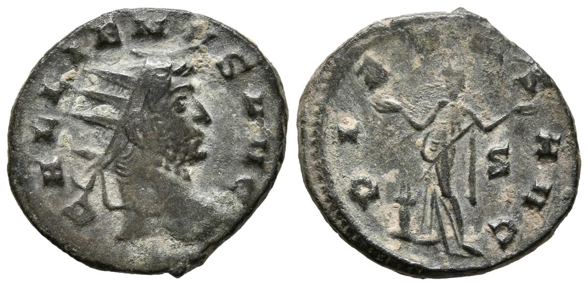 GALIENO. Antoniniano. (Ae. 3,10g/20mm). 265 d.C. Mediolanum. (RIC 507). Anv: Cabeza radiada de Galieno a derecha, alrededor leyenda: GALLIENVS AVG. Rev: Pietas estante a izquierda, delante altar, en campo S, alrededor leyenda: PIETAS AVG. MBC.