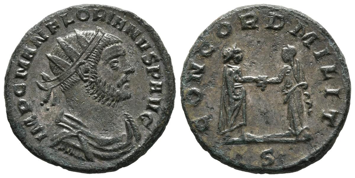 FLORIANO. Antoniniano. (Ve. 4,18g/22mm). 276 d.C. Siscia. (RIC 57). Anv: Busto radiado, drapeado y con coraza de Floriano a derecha, alrededor leyenda: IMP C MAN FLORIANVS P AVG. Rev: Floriano y Concordia enfrentados, dándose la mano, en exergo: S, alrededor leyenda: CONDORD MILIT. EBC-. Escaso.