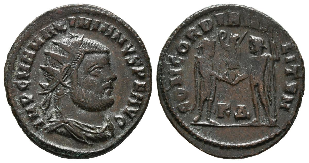 MAXIMIANO. Antoniniano. (Ae. 3,85g/22mm). 295-296 d.C. Cícico. (RIC 13). Anv: Busto radiado, drapeado y con coraza de Maximiano a derecha, alrededor leyenda: IMP C M H MAXIMIANVS P F AVG. Rev: Maximiano estante a derecha recibiendo Victoria de Júpiter estante a izquierda portando cetro, entre ellos KA, alrededor leyenda: CONCORDIA MILITVM. MBC.