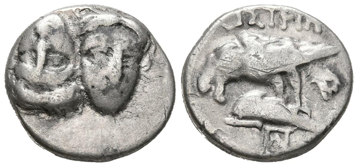 TRACIA, Istros. Dracma. (Ar. 4,97g/18mm). 400-350 a.C. (Seaby 1669). Anv: Dos cabeza invertidas. Rev: Aguila con delfín a izquierda, encima leyenda griega, debajo monograma griego. MBC-.