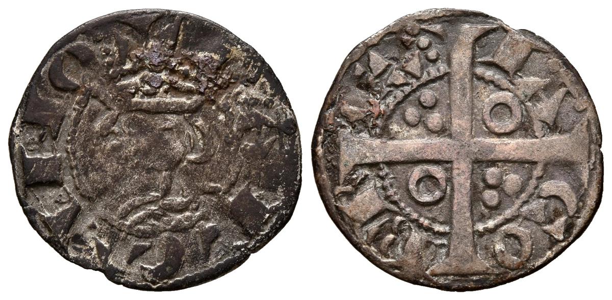 JAUME I (1213-1276). Diner de tern (Ve. 0,79g/17mm). S/D. Barcelona. (Cru.V.S. 308). Anv: Efigie coronada a izquierda, alrededor leyenda: BARQINO. Rev: Cruz con tres puntos en 1º y 4º cuadrante y puntos en 2º y 3º cuadrante, alrededor leyenda: IA CO BR EX. MBC.