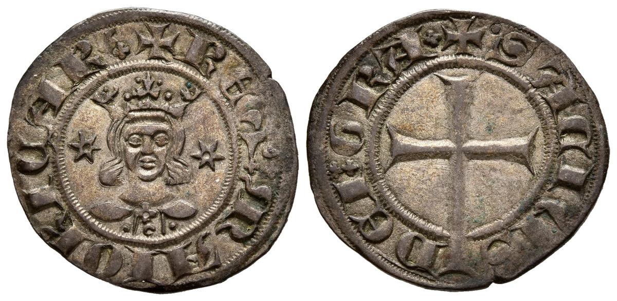 SANCHO I (1311-1324). Dobler (Ve. 1,68g/20mm). Mallorca. (Cru. V.S. 547). Anv: Efigie coronada de frente entre dos estrellas, alrededor leyenda: REX MAIORICAR. Rev: Cruz latina, alrededor leyenda: SACIVS DEI GRA. MBC+. Buen ejemplar.
