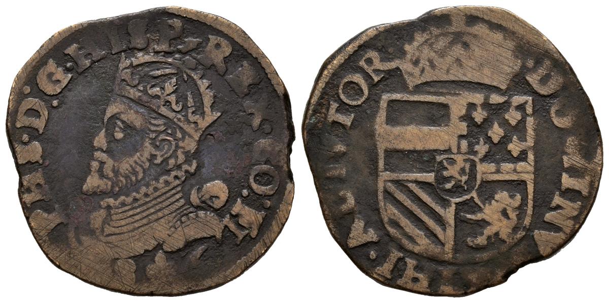 FELIPE II (1556-1598). Liard. (Ae. 5,31g/26mm). 1586. Brujas. (Vicenti 624 var). MBC-. Escaso y más así.