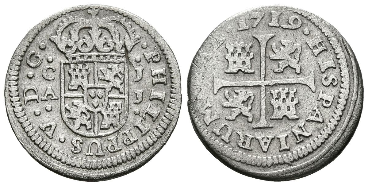 FELIPE V (1700-1746). 1/2 Real. (Ar. 1,37g/16mm). 1719. Madrid JJ. (Cal-2019-105). Leyenda: PHILIPPUS. MBC.