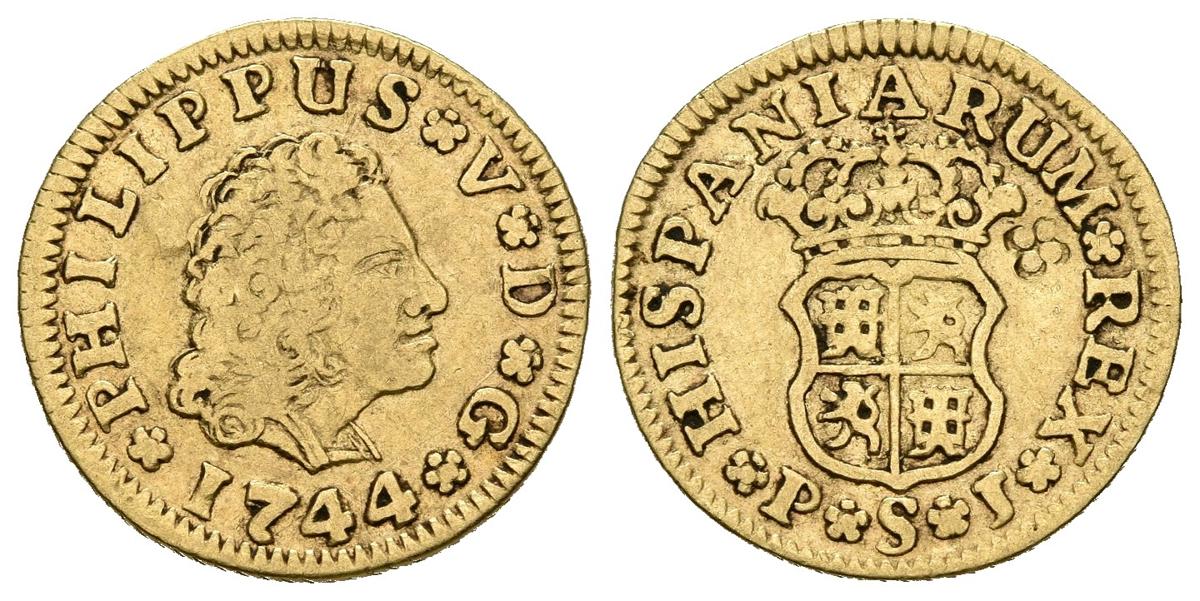 FELIPE V (1700-1746). 1/2 Escudo (Au. 1,74g/15mm). 1744. Sevilla PJ. (Cal-2019-1649). Tercer busto. MBC. Resello de trebol en reverso hecho en el siglo XIX probablemente en California.