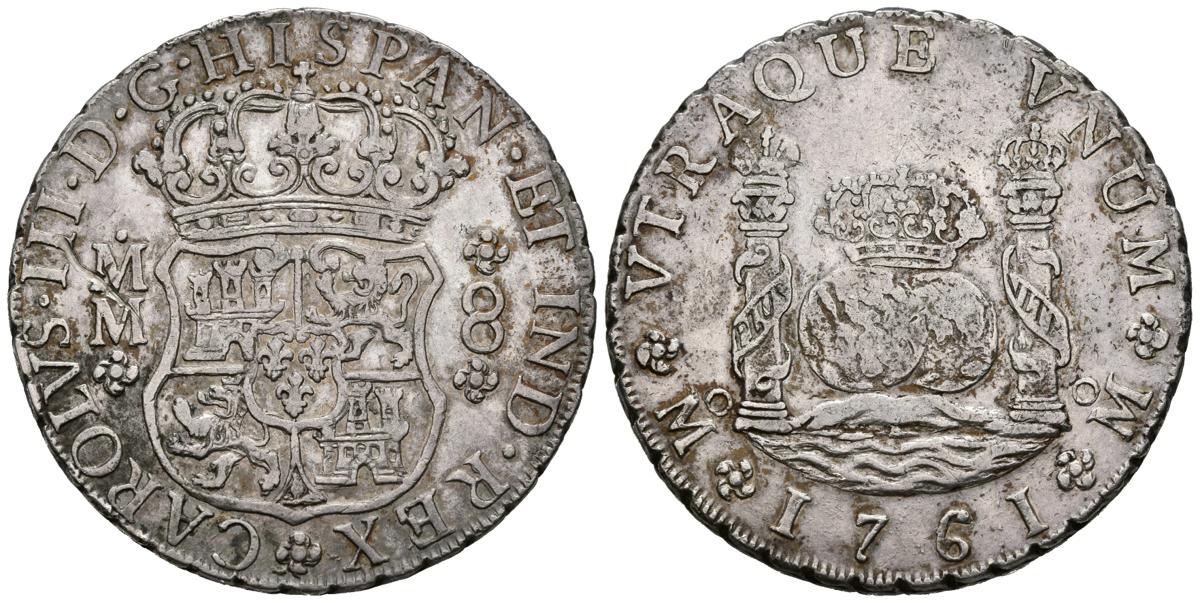 CARLOS III (1759-1788). 8 reales (Ar. 26,96g/38mm). 1761. México MM. (Cal-2019-1074). Cruz entre I y S. MBC+/MBC.