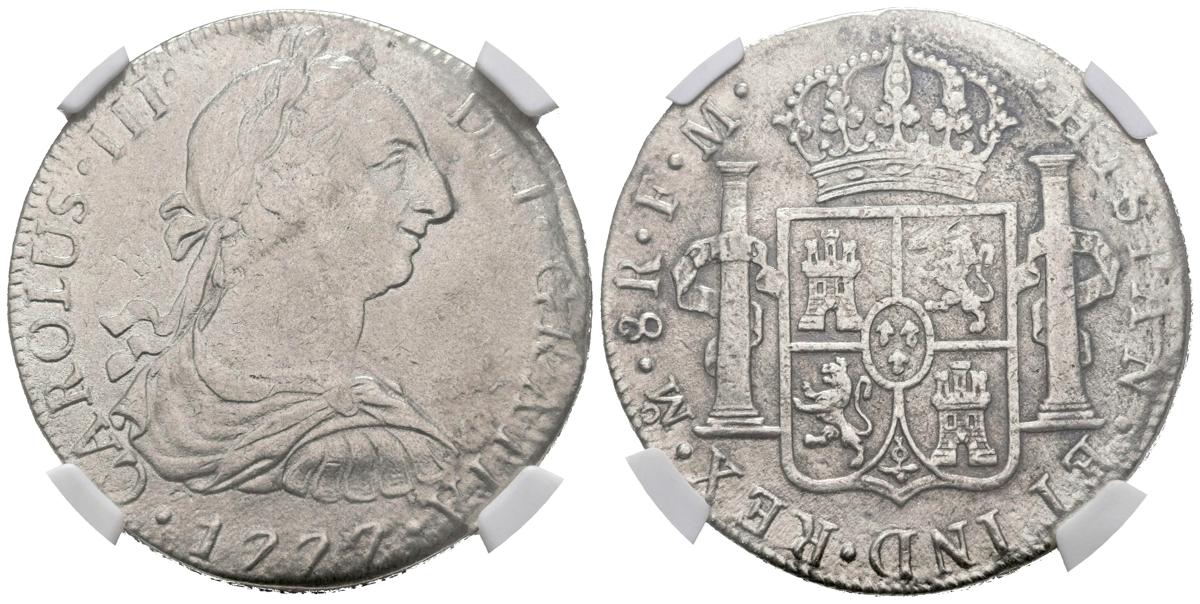 CARLOS III (1759-1788). 8 Reales (Ar. 27,00g/38mm)*. 1777. México FM. (Cal-2019-1112). MBC+. Procedente de El Cazador. Encapsulada por NGC. *Peso y medida teóricos.