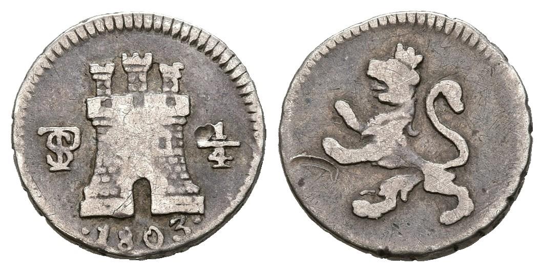 CARLOS IV (1788-1808). 1/4 Real (Ar. 0,81g/11mm). 1803. Potosí. (Cal-2019-153). BC+. Golpes.