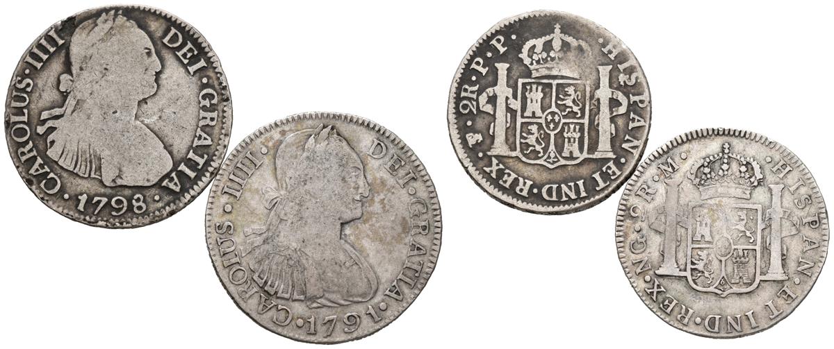 CARLOS IV (1788-1808). Conjunto de 2 monedas de 2 Reales acuñados en 1791 y 1798 en las cecas de Guatemala y Potosí respectivamente. Diferentes estados de conservación. A EXAMINAR.