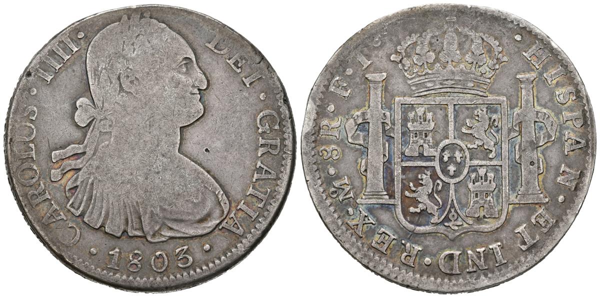 CARLOS IV (1788-1808). 8 Reales. (Ar. 26,39g/39mm). 1803. México FT. (Cal-2019-977). BC-.