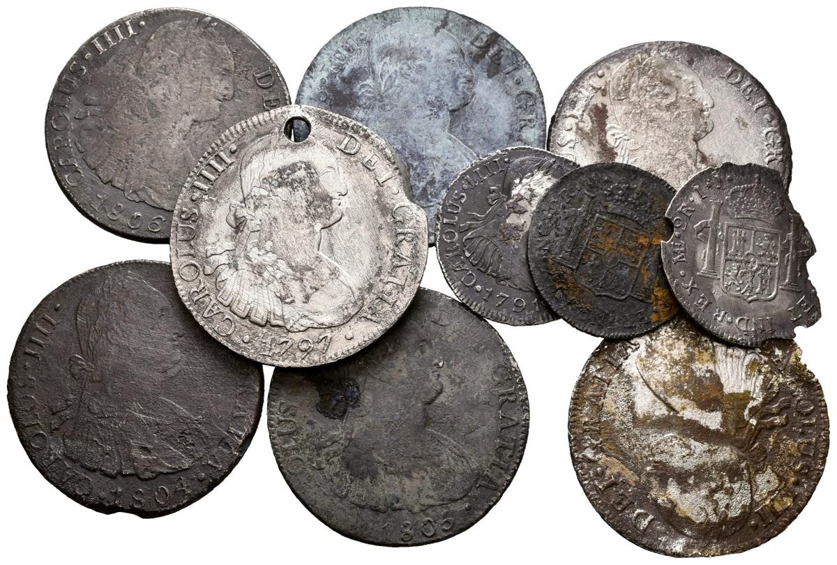 CARLOS IV. Lote compuesto por 10 monedas de plata (7 de ellas de 8 Reales y 3 del módulo de 2 Reales). Conteniendo: 4 monedas de 8 Reales de la ceca de México (1797 (FM), 1803 (FT), 1804 (TH) y 1805 (TH)); 3 de 8 Reales de Lima (1798 (IJ), 1804 (JP) Y 1805 (JP)); Del módulo de 2 Reales, 2 piezas de Guatemala (179? y 1791 (M)) y una de Lima de 1793 (IJ)). Ninguna pieza repetida. Diferentes estados de conservación. Todas presentan oxidaciones. A EXAMINAR.