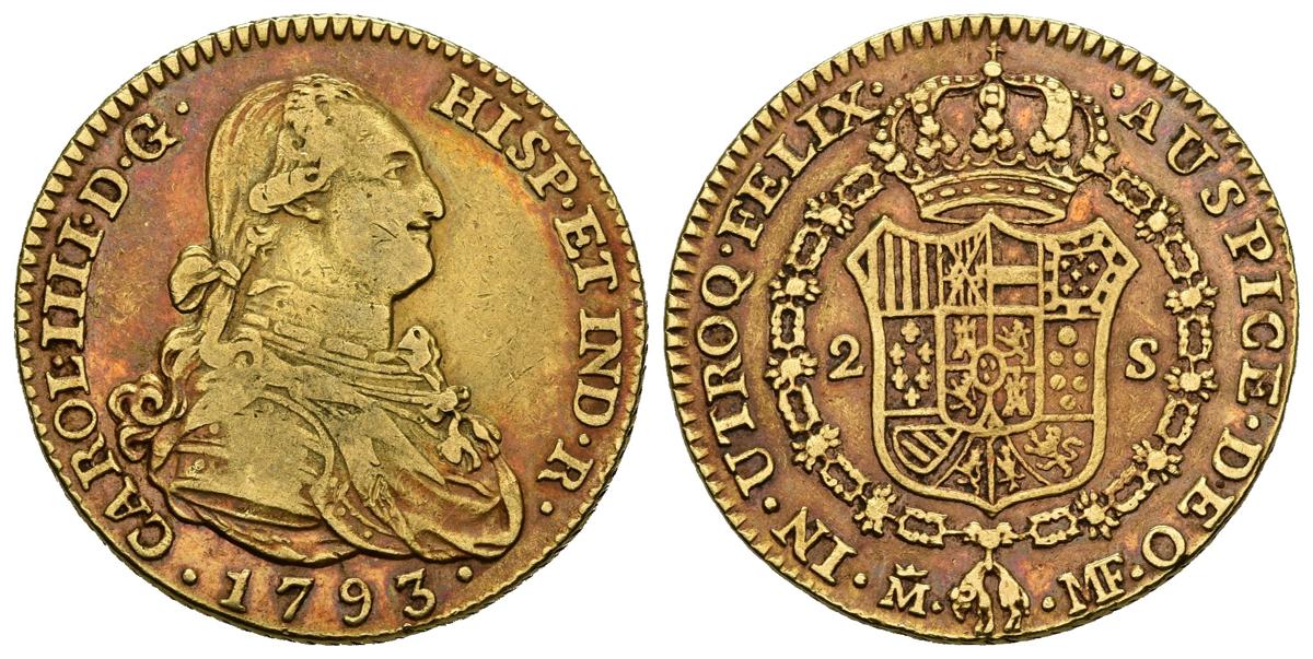 CARLOS IV (1788-1808). 2 Escudos. (Au. 6,66g/22mm). 1793. Madrid MF. (Cal-2019-1279). MBC-. Ligera pátina irisada.
