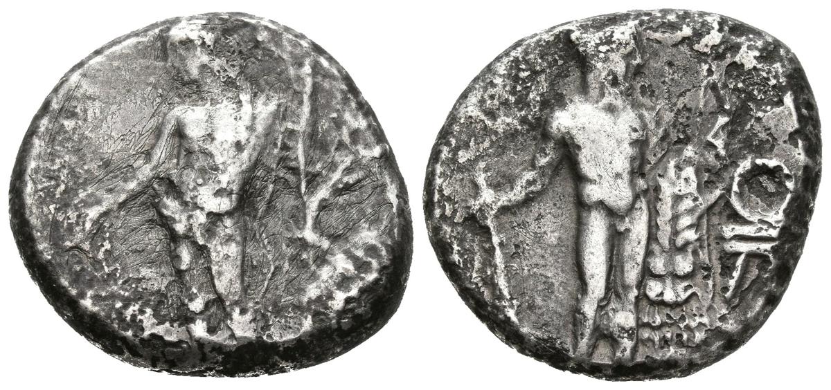 CILICIA, Issos. Estátera. (Ar. 9,95g/22mm). 400 a.C. (Seaby 5553; SNG Levante 173). Anv: Hércules estante a derecha apoyado sobre clava, portando arco y piel de león, delante monograma griego. Rev: Apolo estante a izquierda apoyado sobre palma, portando patera y cetro, debajo leyenda griega. MBC-.