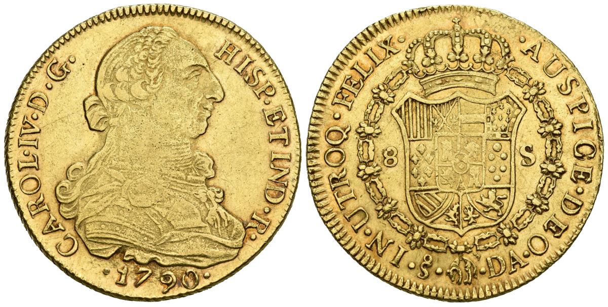 CARLOS IV (1788-1808). 8 Escudos (Au. 27,00g/37mm). 1790. Santiago DA. (Cal-2019-1752). Busto de Carlos III. Ordinal IV. MBC.
