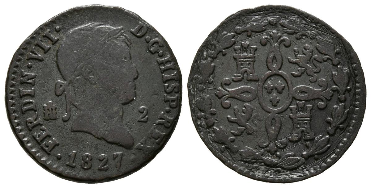 FERNANDO VII (1833-1868). 2 Maravedís (Ae. 2,03g/19mm). 1827. Segovia. (Cal-2019-149). BC+/MBC-.