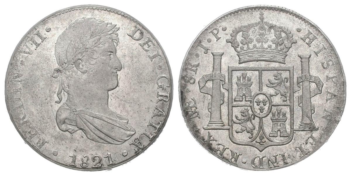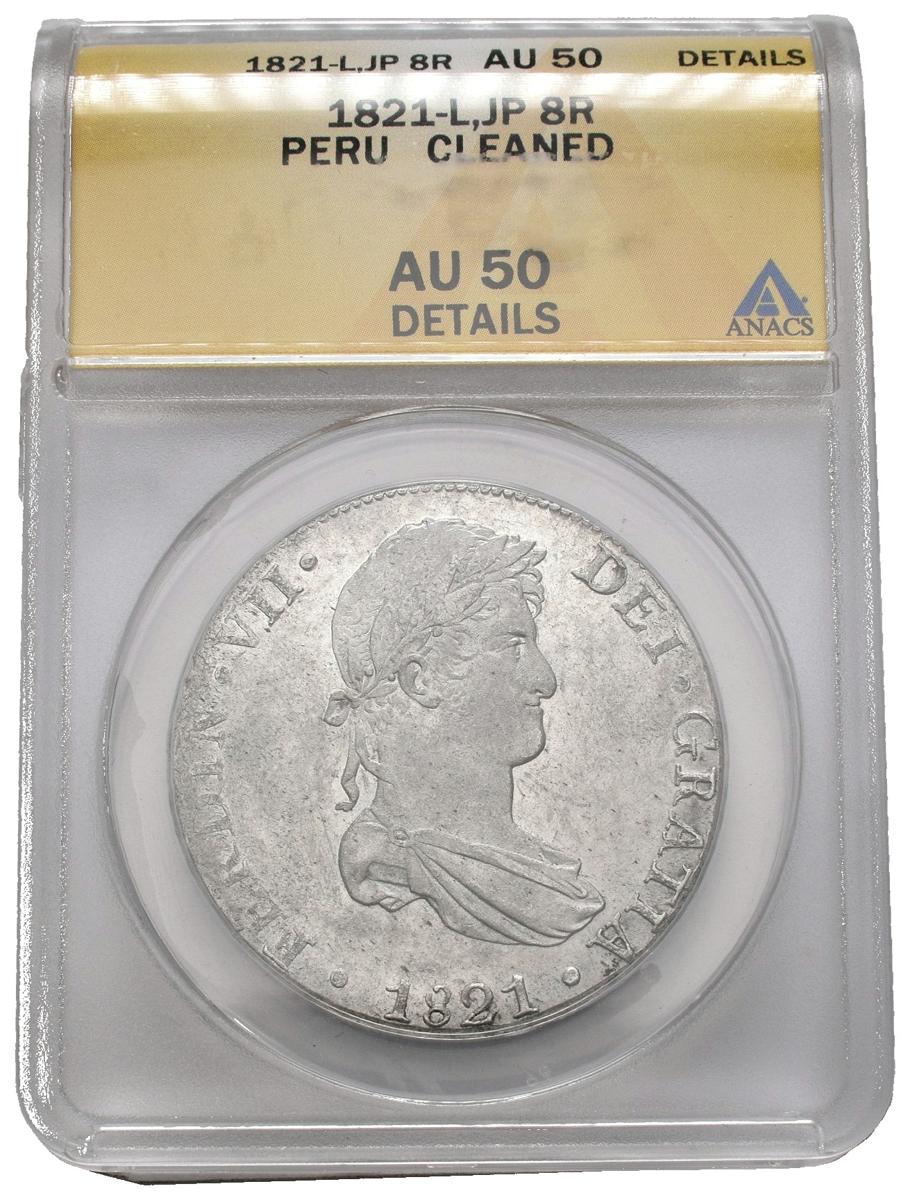 FERNANDO VII (1808-1833). 8 Reales (Ar. 27,00g/38mm)*. 1821. Lima JP. (Cal-2019-1254). AU 50 Details. Limpiada. Encapsulada por ANACS. *Peso y medida teóricos.