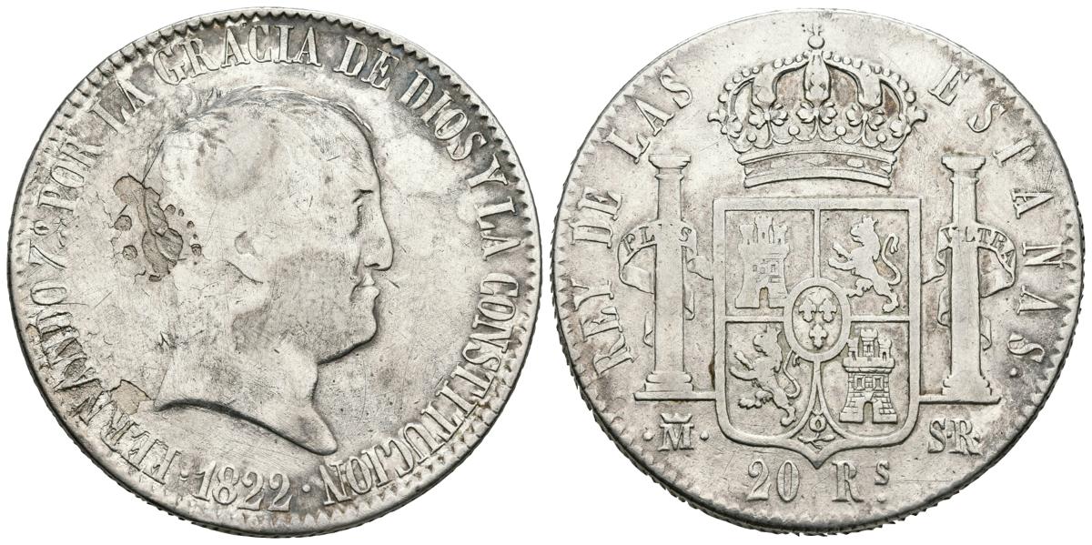 FERNANDO VII (1808-1833). 20 Reales. (Ar. 26,82g/38mm). 1822. Madrid SR. (Cal-2019-1282). BC+. Oxidaciones limpiadas. Hojas saltadas en anverso.