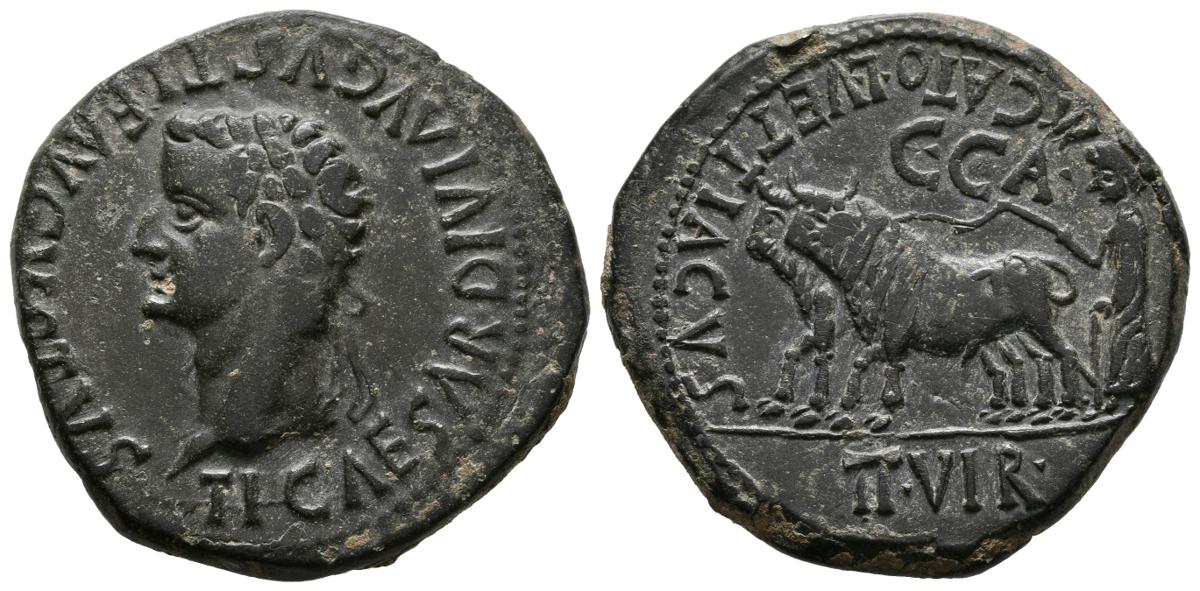 CAESARAUGUSTA (Zaragoza). As. (Ae. 14,49g/29mm). 14-36 d.C. (FAB-361). Anv: Cabeza laureada de Tiberio a izquierda, alrededor leyenda: TI CAESAR DIVI AVG F AVGVSTVS. Rev: Yunta a izquierda, encima: CCA, debajo: II VIR, alrededor leyenda: M CATO L VETTIACVS. MBC.