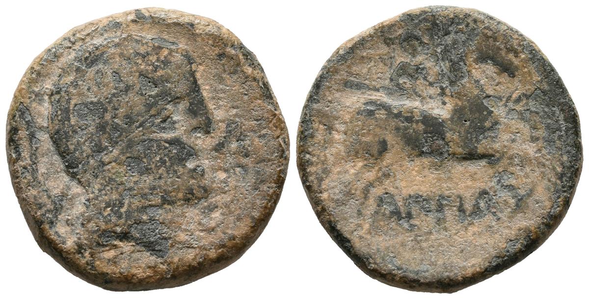 CAISCATA (Cascante, Navarra). As. (Ae. 10,21g/19mm). 120-20 a.C. (FAB-687). Anv: Cabeza masculina barbada a derecha, delante letra ibérica Ca, detrás arado. Rev: Jinete con lanza a derecha, debajo leyenda ibérica: CaISCaTa. BC. Escaso.