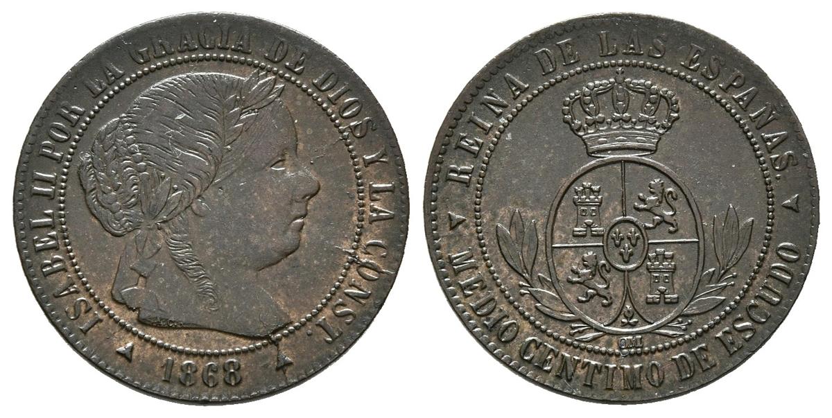 ISABEL II (1833-1868). 1/2 Céntimo de Escudo. (Ae. 1,19g/16mm). 1868. Segovia OM. (Cal-2019-210). EBC.