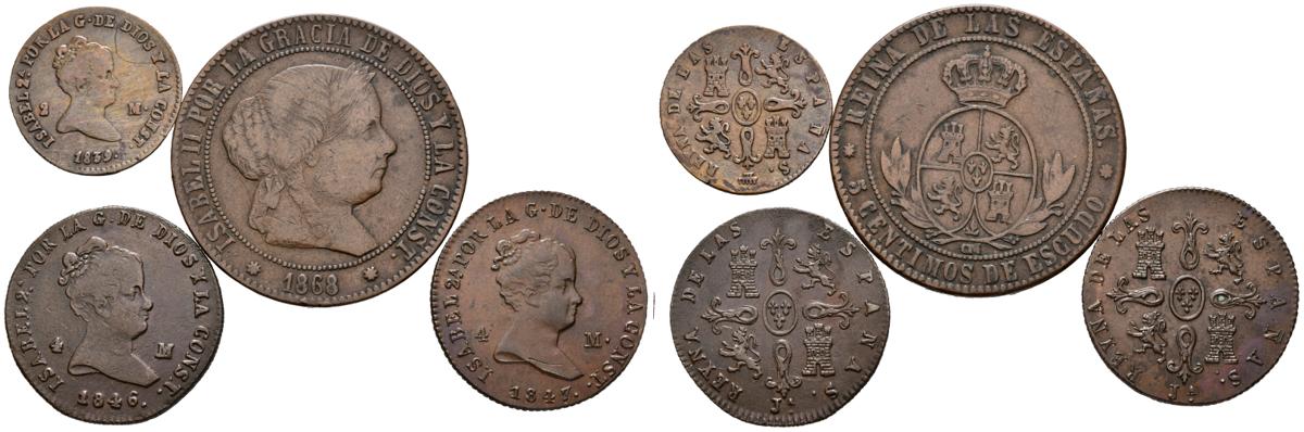 ISABEL II. Bonito conjunto formado por 4 cobres de diferentes valores y cecas, destacando dos monedas de 4 maravedís de Jubia. Diferentes estados de conservación. A EXAMINAR.