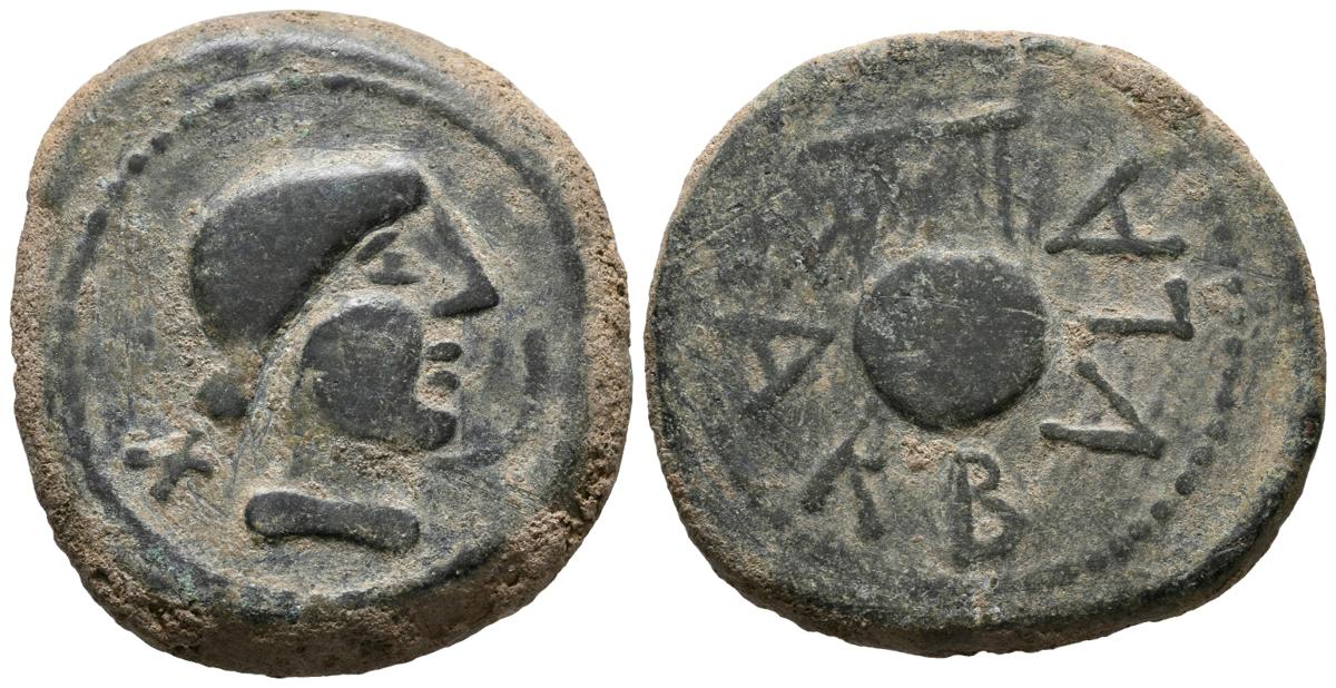 CARBULA (Almodóvar del Río, Córdoba). As. (Ae. 23,54g/34mm). 80 a.C. (FAB-440). Anv: Cabeza de Apolo a derecha, detrás letra ibérica: Ta, delante serpiente. Rev: Lira, debajo leyenda: CARBVLA. MBC.