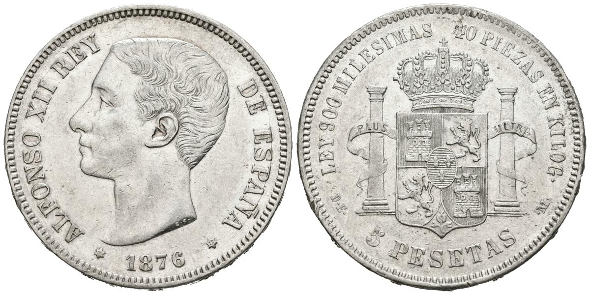 ALFONSO XII (1874-1885). 5 Pesetas (Ar. 25,00g/37mm). 1876 *18-76. Madrid DEM. (Cal-2019-37). MBC+. Marquitas. Primera estrella floja.
