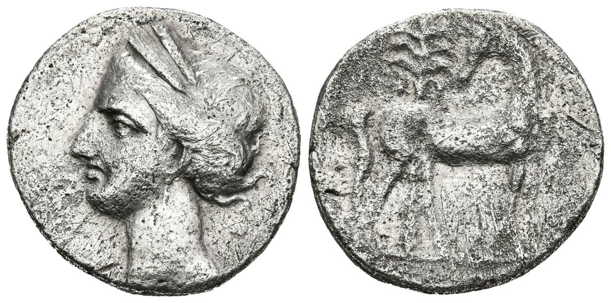 CARTAGONOVA (Cartagena, Murcia). Shekel. (Ar. 6,74g/21mm). 220-215 a.C. (FAB-498). Anv: Cabeza de Tanit a izquierda. Rev: Caballo parado a derecha mirando a izquierda, detrás palmera. MBC. Oxidaciones limpiadas.