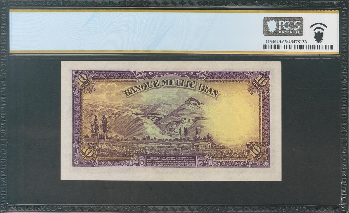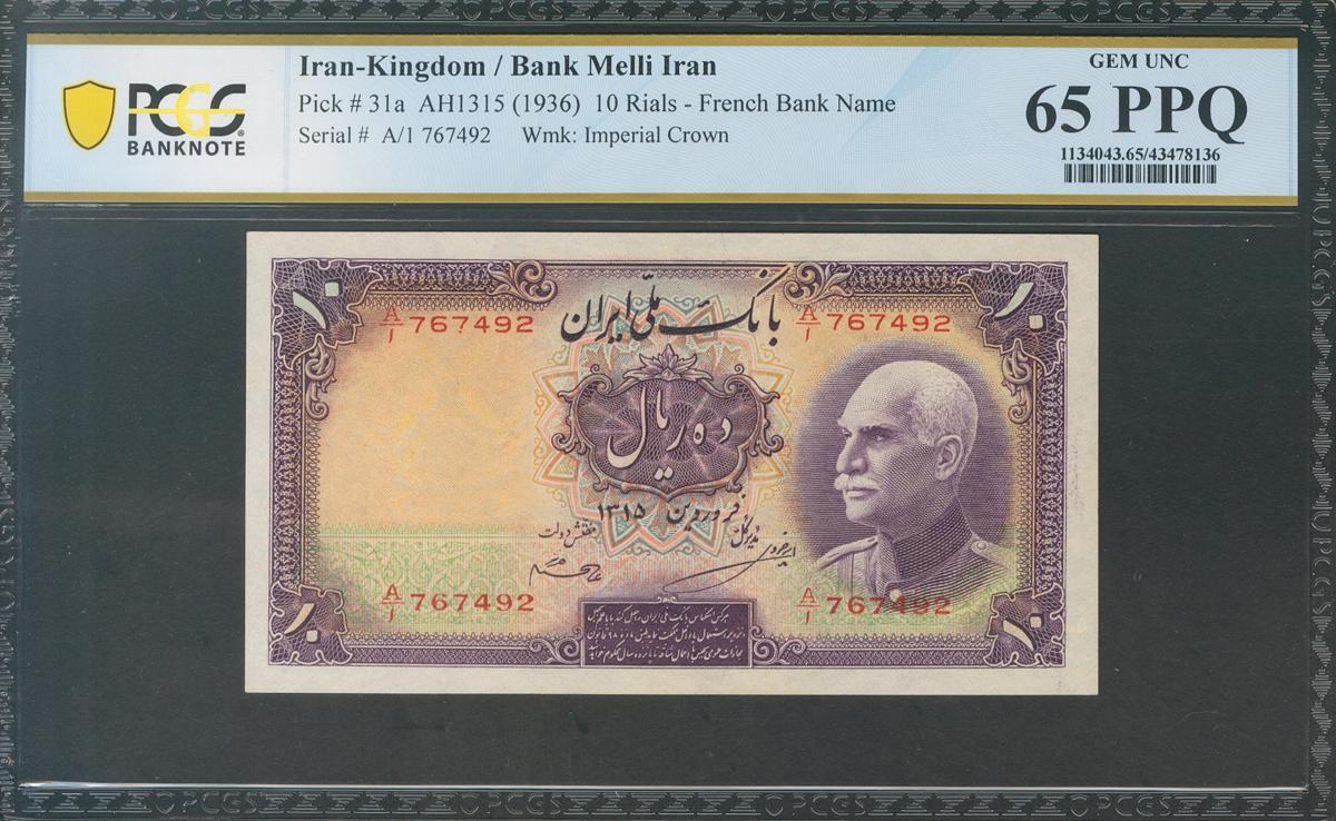 IRAN. 10 Rials. 1936 (SH 1315). National Bank. French texts and western numerals. (Pick: 31a). Rare. Gem Uncirculated. PCGS65PPQ.