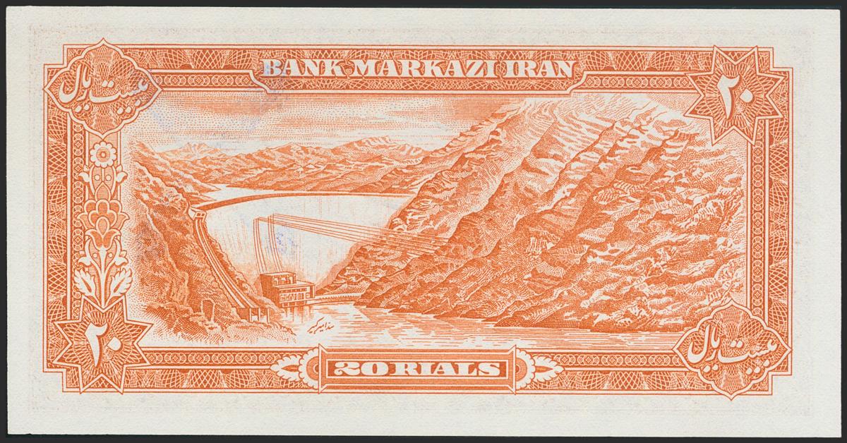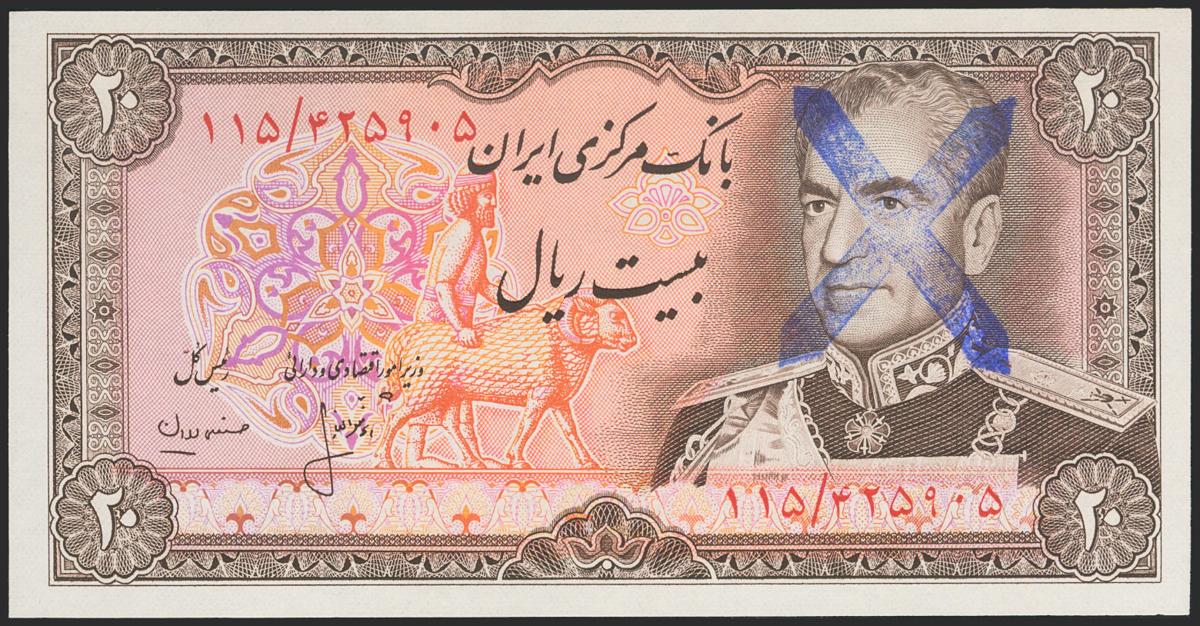 IRAN. 20 Rials. (No date). Revolutionary overprints. Signatures: Mehran and Ansary, blue X stamped on vignette over 100a2. (Pick: Not listed). Rare. Uncirculated.