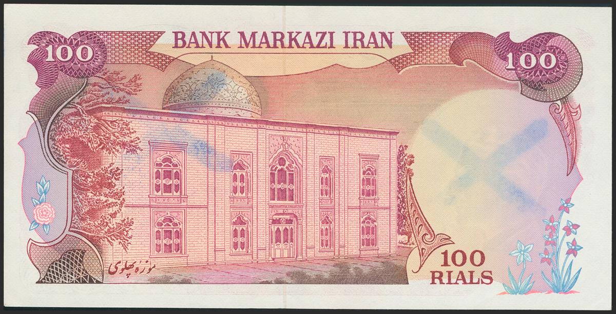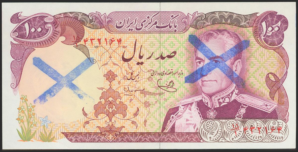 IRAN. 100 Rials. (No date). Revolutionary overprints. Signatures: Mehran and Yeganeh, blue X stamped on vignette and watermark on 102d. (Pick: Not listed). Minor mishandling on lower right corner. Rare. About Uncirculated.