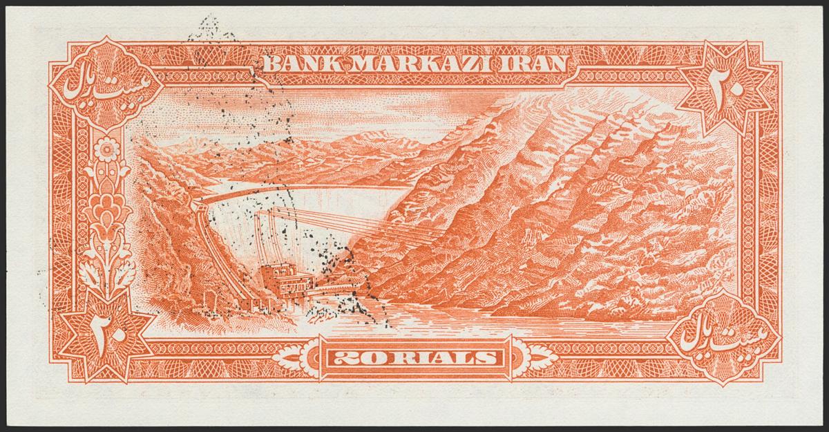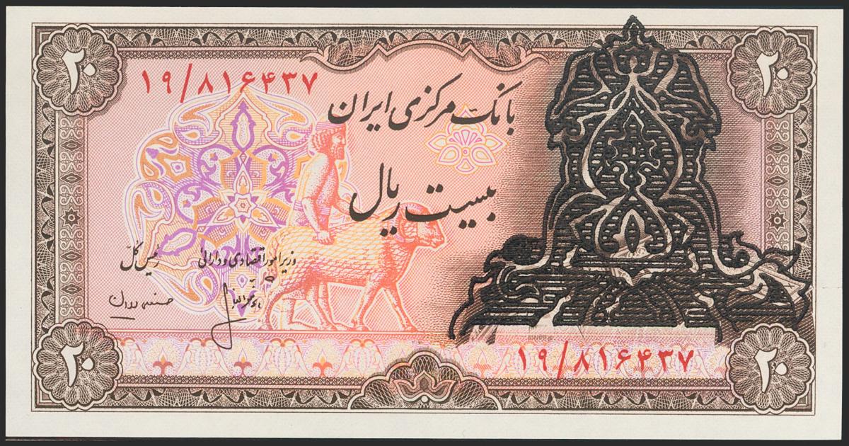 IRAN. 20 Rials. (No date). Islamic Republic provisional issues. Signatures: Mehran and Ansary, type 1 and portrait overprint A on 100a1. (Pick: 110a). Uncirculated.