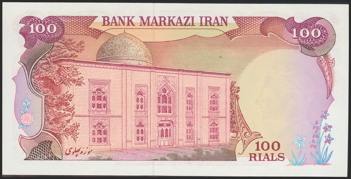 IRAN. 100 Rials. (No date). Islamic Republic provisional issues. Signatures: Mehran and Yeganeh, type 1 nad portrait overprint C on 102c. (Pick: 112b). Uncirculated.