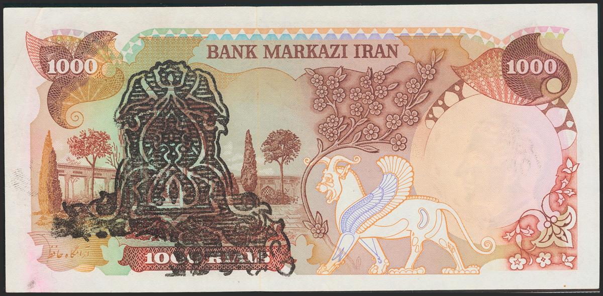 IRAN. 1000 Rials. (No date). Islamic Republic provisional issues. Signatures: Mehran and Ansary, type 1 and portrait overprint G on 105b. PRINTING ERROR. Overprint on back was actually transferred from another freshly stamped banknote placed below. (Pick: 115a). Paper wave on top margin. Very rare. Extremely Fine.