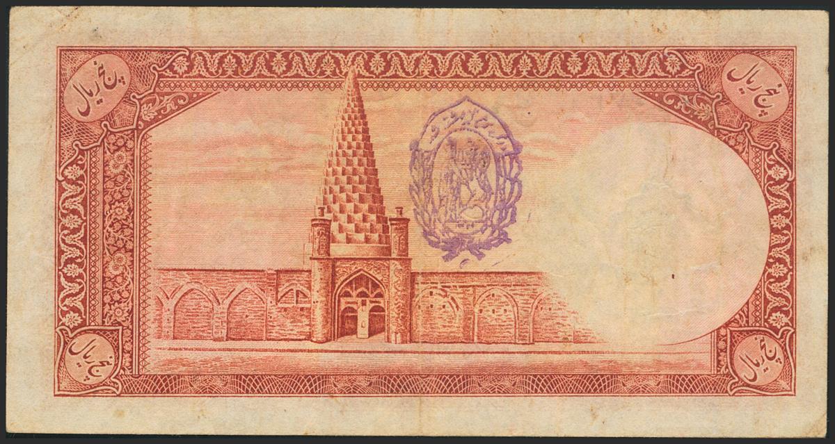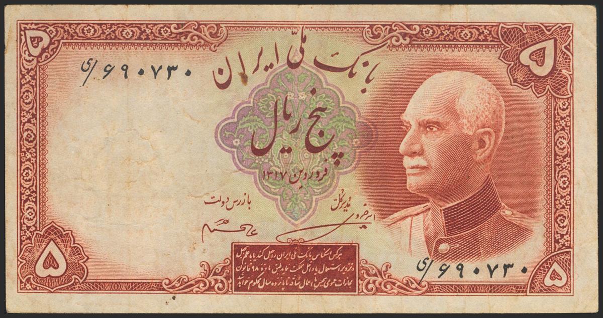 IRAN. 5 Rials. 1938 (SH 1317). National Bank. Persian texts and numerals, with purple overprint (1321). (Pick: 32Ae). Very Fine.