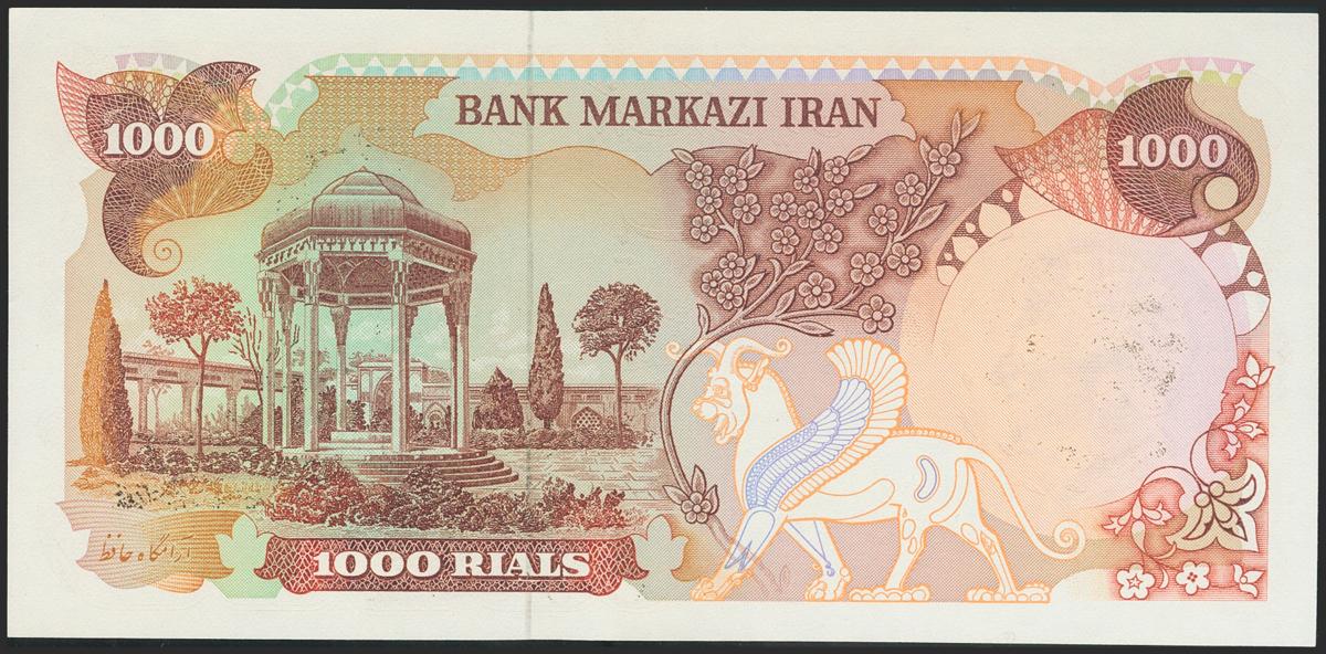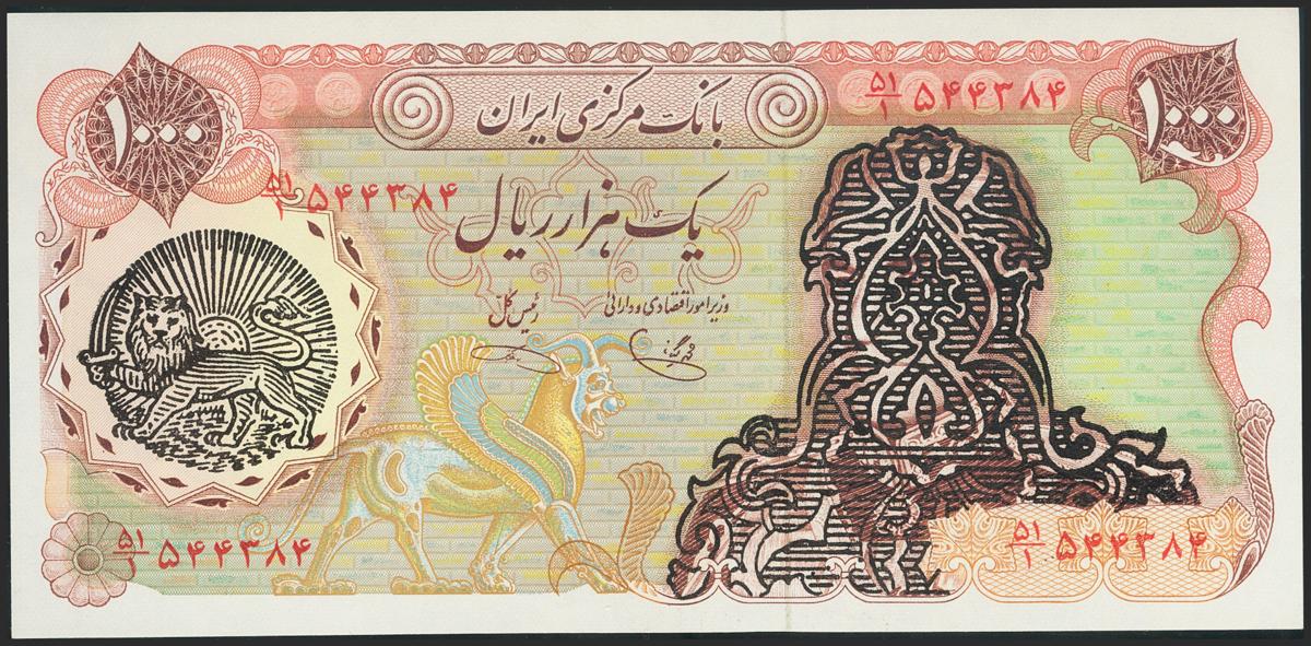 IRAN. 1000 Rials. (No date). Islamic Republic provisional issues. Signatures: Khoshkish and Yeganeh, type 2 and portrait overprint G on 105d. (Pick: 121c). Uncirculated.