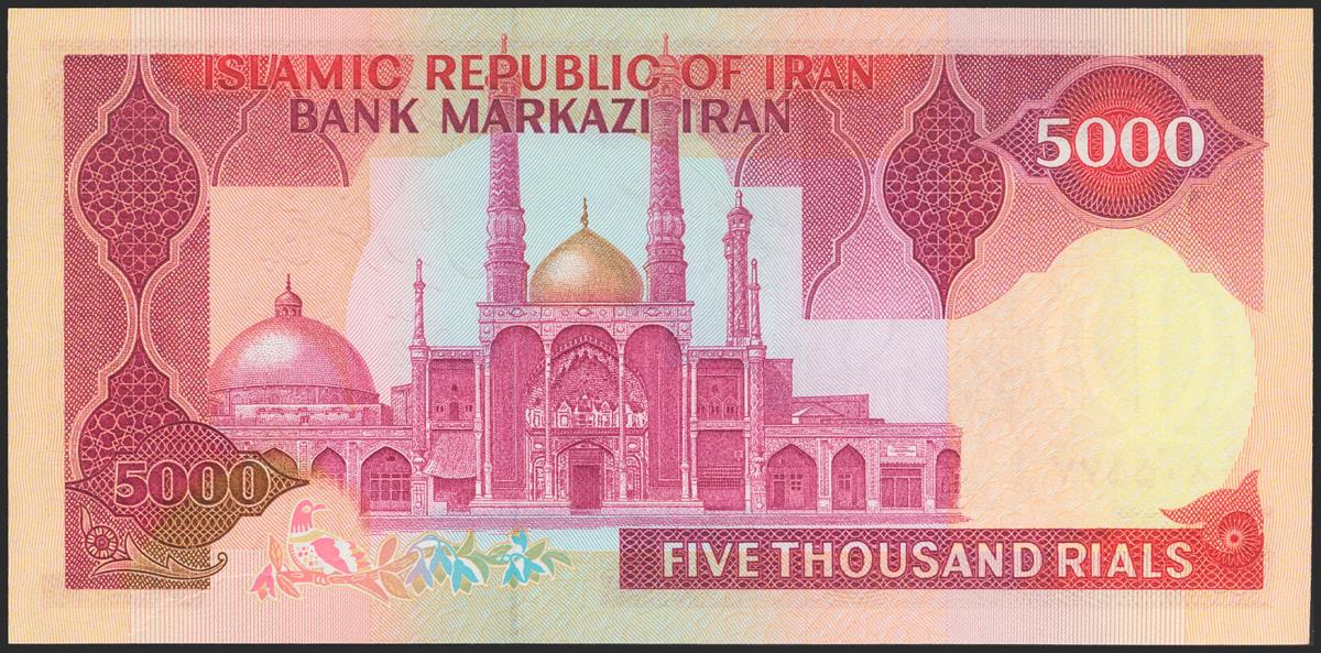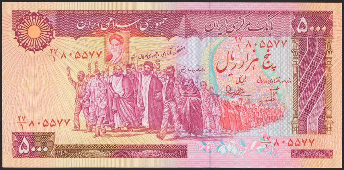 IRAN. 5000 Rials. 1981. Islamic Republic. Signatures: Nobari and Bani-Sadr. (Pick: 133). Small paper lump on right bottom. Uncirculated.