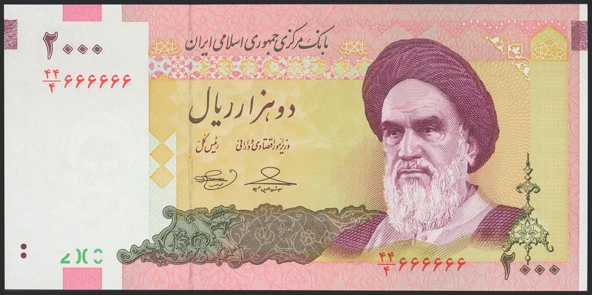 IRAN. 2000 Rials. 2009. Central Bank. Solid serial number in a solid fractional series: 44/4 666666. (Pick: 144d). Extremely Rare. Uncirculated.