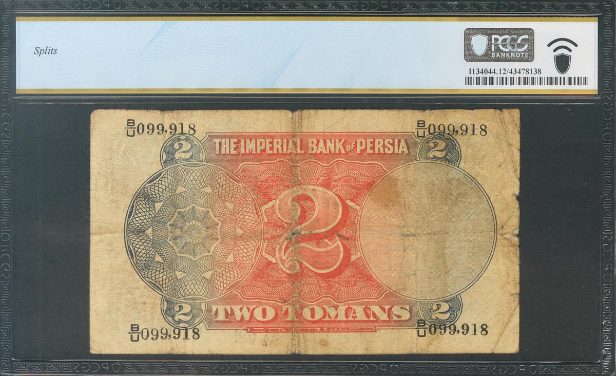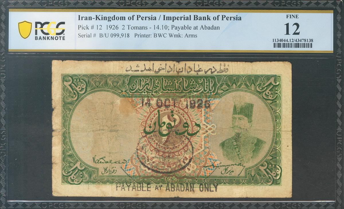 IRAN. 2 Toman. 1926. Imperial Bank. Payable at Abadan only (handstamped) and black serial number. (Pick: 12). Very rare. Fine. PCGS12 (splits).