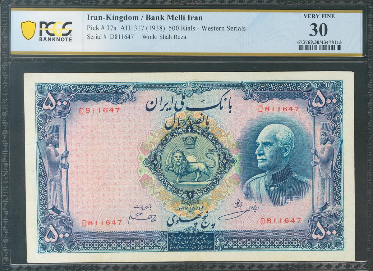 IRAN. 500 Rials. 1938 (SH 1317). National Bank. Persian texts and western numerals. (Pick: 37a). Very rare. Very Fine. PCGS30.
