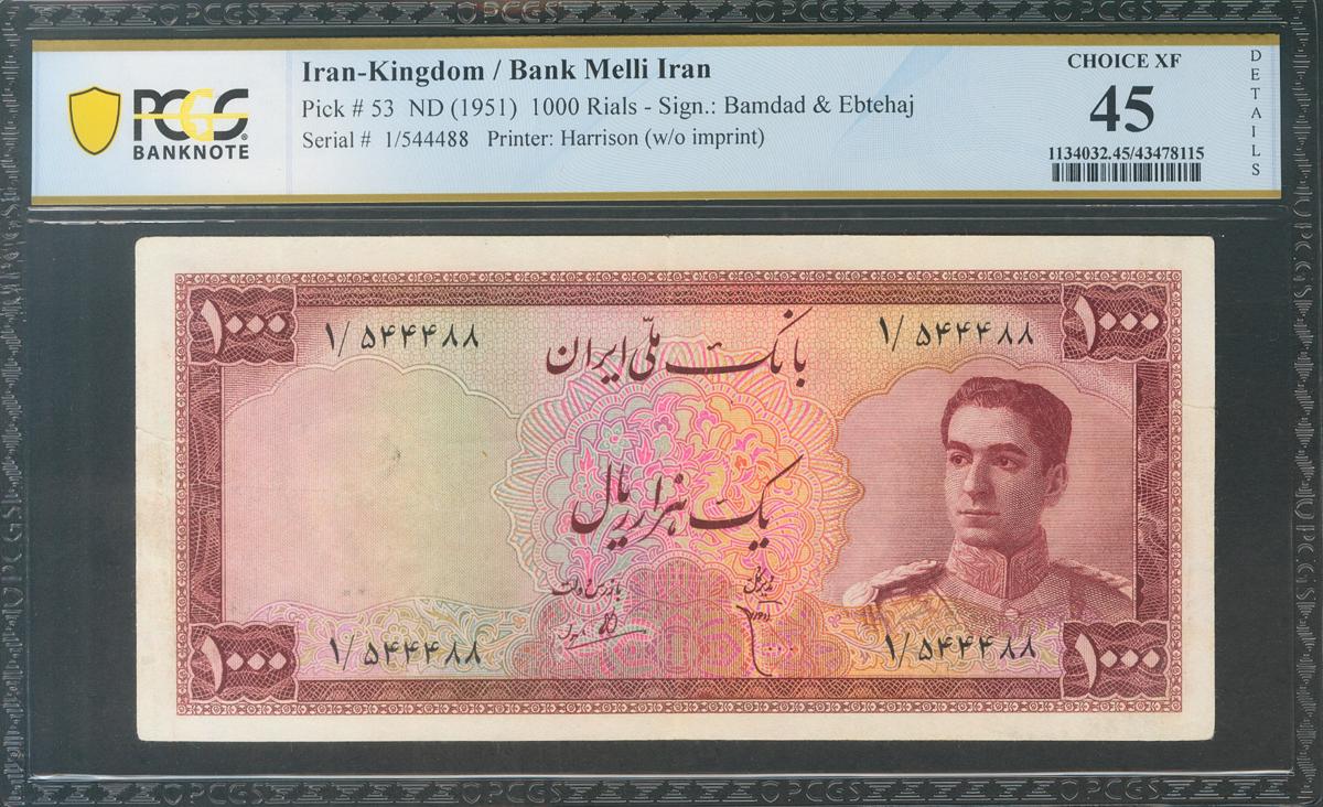 IRAN. 1000 Rials. 1951. National Bank. (Pick: 53). Extremely Fine. PCGS45 (edge tears).