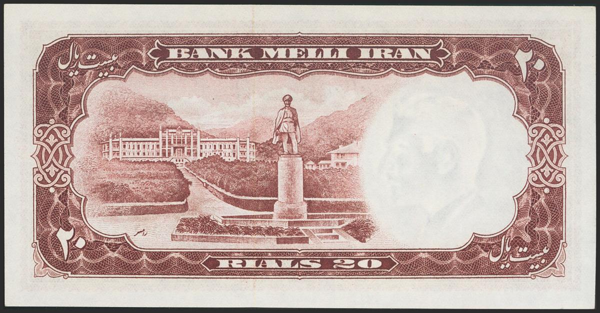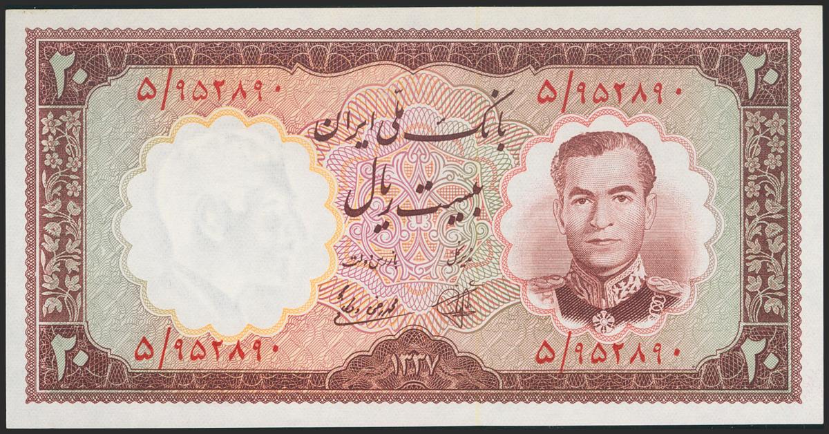 IRAN. 20 Rials. 1958 (SH 1337). National Bank. Signatures: Vishkai and Kashani, red serial number. (Pick: 69). Uncirculated.