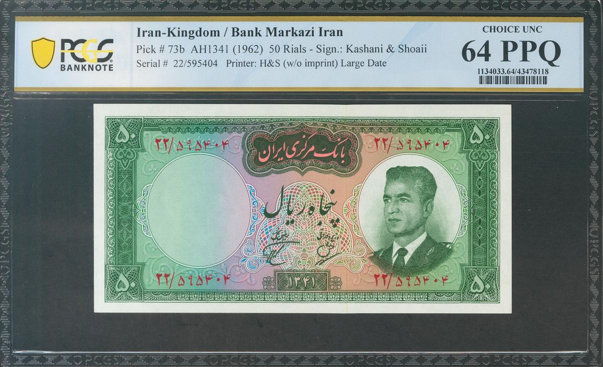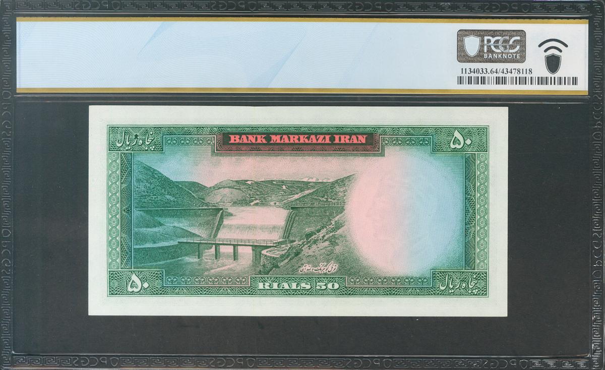 IRAN. 50 Rials. 1962 (SH 1341). National Bank. Signatures: Pouhomayoun and Behnia. (Pick: 73b). Choice Uncirculated. PCGS64PPQ.